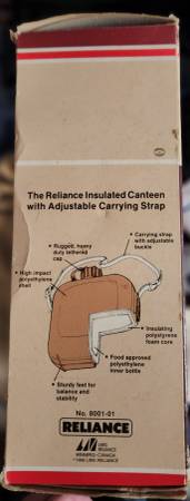 New in Original Box! Reliance Insulated Canteen Adjustable Strap, 1 Quart Capacity Please call or text me if you are interested, no e-mails please: Six-1-two 3-nine-1 one-1-7-nine