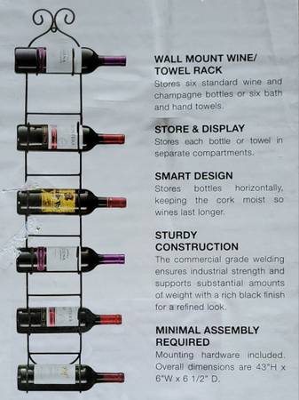 I'm selling a brand new wall mounted rack that can be used to hold towels or bottles of wine. It's in the original box and includes the mounting hardware. Sale is cash only and we can meet near the...
