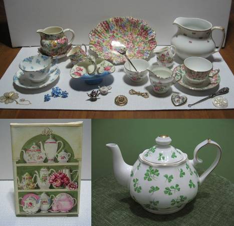 Here is a lot of beautiful vintage china, Bone China, sterling, Chintz ware, cream and sugar pieces, tea cups and saucers, jewelry, pins, antique sterling silver shoe buttoner, scarf clip, book marker, earrings, miniature teapots, Royal Doulton basket, pitcher, Shamrock Teapot, canvas picture of china teapots. You will not be disappointed with these stunning items. They're all in very good to excellent condition.
