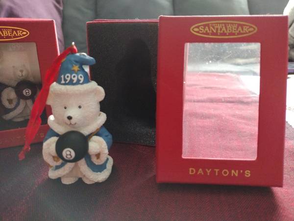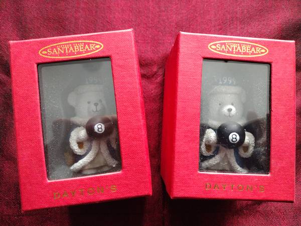 2 NIB 1999 Dayton's Fifteen Years SantaBear Christmas tree ornaments with magic 8 ball.