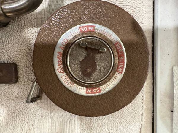 • Evans Co. 50’ Measuring Tape Reel – Metal housing, retractable, clear markings, still retracts.