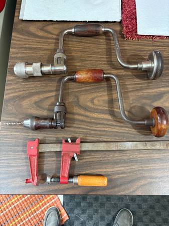 • Brace Drill (Manufacturer Unknown) – Beautiful hardwood handle and knob, solid build, a timeless piece of hand-powered ingenuity.