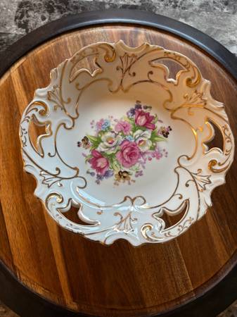 Add timeless charm to your home with this beautiful vintage pedestal dish made in Japan. This decorative porcelain piece features an ornate reticulated (openwork) edge with intricate gold detailing, complemented by a vivid floral centerpiece of roses and other blooms. The scalloped rim and pedestal base give it a delicate, elevated look that makes it perfect as a centerpiece, candy dish, or accent décor for a vintage or shabby chic style.