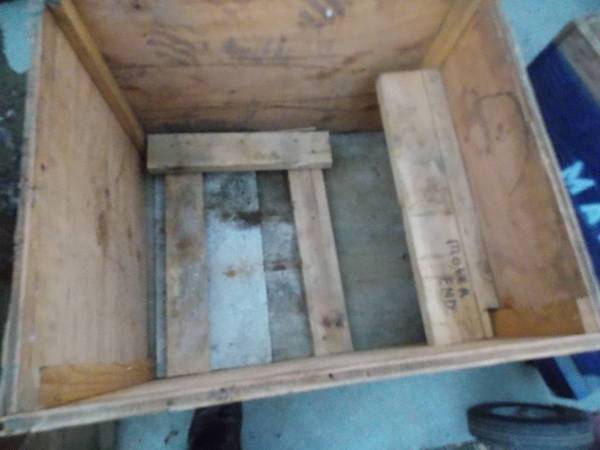 ((Update, Only the plain wood one on the Left is still here for sale)) Warehouse Pallet Jack Forklift Wood moving crates Storage Protection. Price is each, but you must buy them all(OK, only 2 box Boxes left). The super heavy duty blue ones are 28" wide x 25" deep and 24" tall. The bare wood one is 31" x 19" x 24" tall .A Fork Lift or pallet jack will go under these for easy moving around. We found the wood lids for the (2) blue ones also. The Blue ones are so tuff they could be thrown off a loading dock and not be hurt. The pieces inside the blue wooden ones can be removed to make them one open inside. It would cost over $400 for parts and labor to make these box units. Call (952)854-5 seven eight six