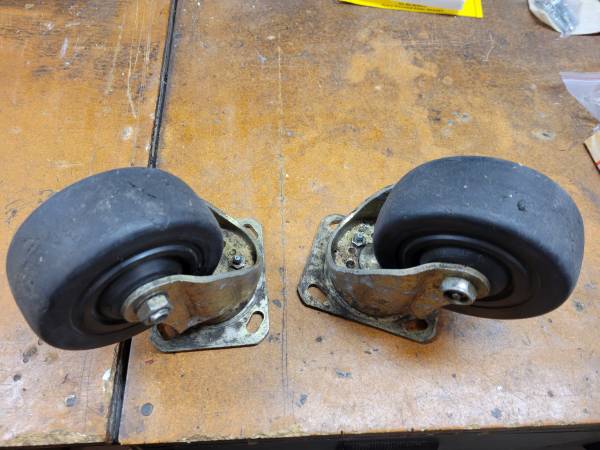 These are heavy-duty. I don't know the rating. Probably 500 lbs. or more each. 5 inch diameter wheel, 2 inches wide, 6 1/2 inch total height. The wheel is hard, not rubber. Ball bearings. Grease...