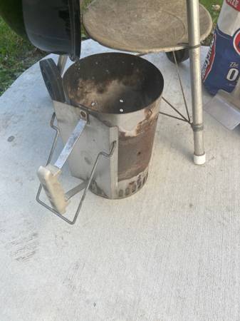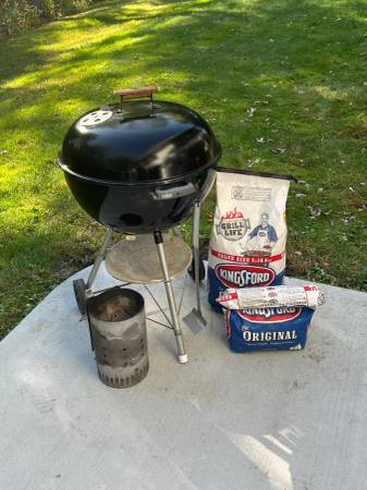 It comes with a charcoal chimney starter, charcoal rake, tube smoker, grate cleaner, a on full bag and one-half bag of Kingsford briquets.