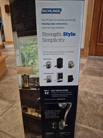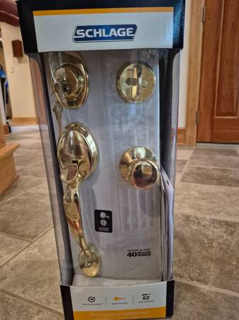 New Schlage door handle with lock the package has been opened but we never used it. See attached pictures for the dimensions of this lock.