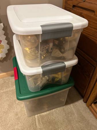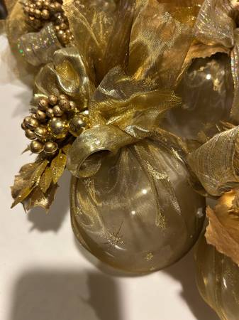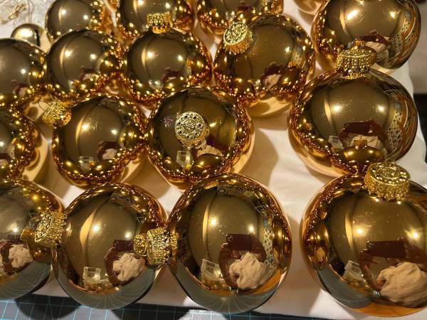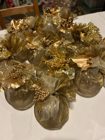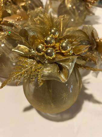 I usually decorated 7-8 Christmas trees around our BandB. I retired and want these gorgeous decorations to shine brightly in a new home! This lot includes: 14 large gold handmade glass 4” hanging...