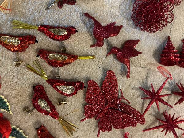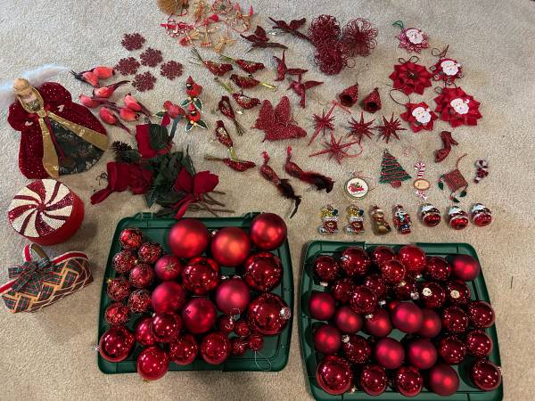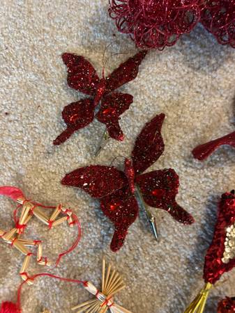 As an Innkeeper i usually decorated 7-8 Christmas trees to display throughout our B&B. I’m retired now and I want these gorgeous decorations to adorn and sparkle someone’s home! Many were purchased from a wholesale florist. Others from Michael’s. All 127 pieces are in good condition.