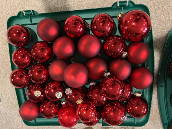 Red glass or plastic shatterproof balls are 6 X-Large, 49 large and 4 small