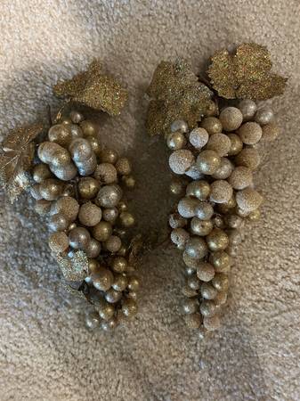 2 glittered gold grape clusters with leaves