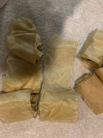 26 feet (approximately) 6” gold wired ribbon in 8 pieces that are 3 to 6 feet in length. Used and stored in a pet free and smoke free home!