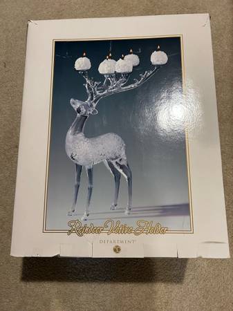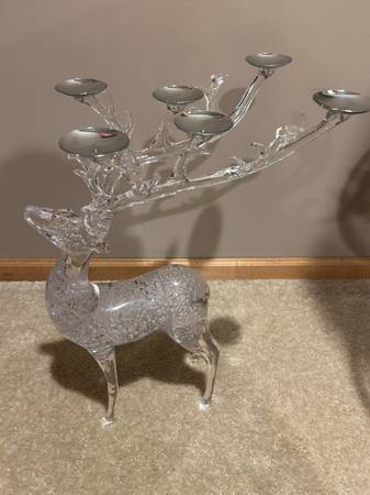 In original box and in perfect condition as used only a few times. Made of bubbled acrylic that looks like glass. Stands about 19 inches tall without votives (not included).