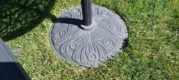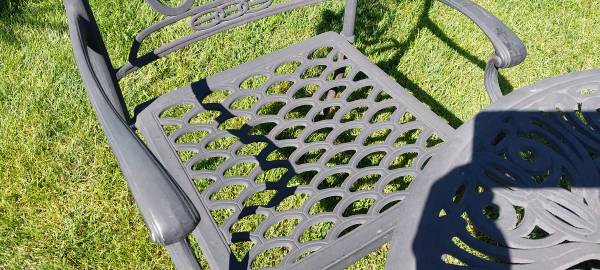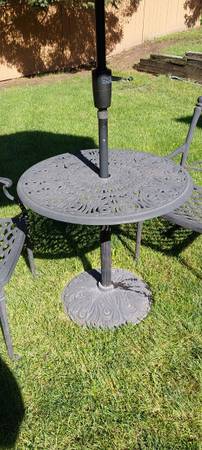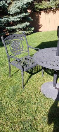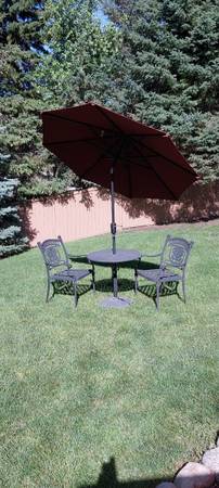 29" Table with Two Chairs and Umbrella Heavy duty iron with a solid weighted base. See pictures for details. Stored indoors in winter. Very nice condition. Call or text no emails please