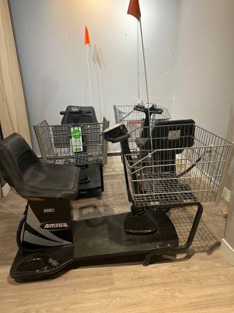 Amigo motorized shopping cart, commonly found in grocery and retail stores. Key features include: Function: Provides mobility assistance for shoppers. Capacity: Can hold up to 500 lbs for the rider and 150 lbs in the basket. Power: Equipped with a 24-volt battery system and rear-wheel drive for better performance on inclines. Safety: Features a safety seat switch that prevents movement when the user is not seated. Controls: Designed for easy customer use, with speed control up to 2.2 mph. Additional Features: May include an LED battery level indicator and a lighted charge cord. Manufacturer: Made by Amigo, a company specializing in mobility solutions for retail environments.