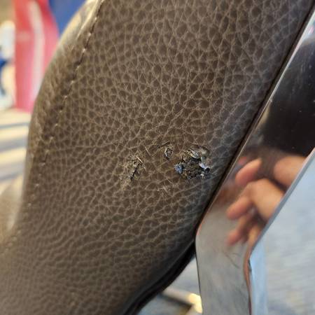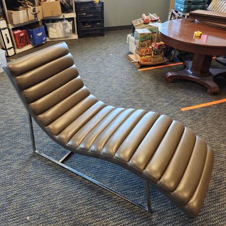 Brown leather chaise lounge bench seat on stainless steel frame. 34" tall and 59" long.
