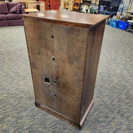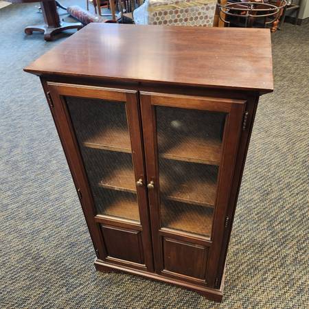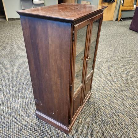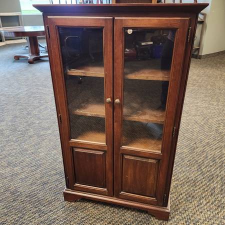 Four tier glass door wood cabinet. 45.5" tall, 27" wide, 18" deep.