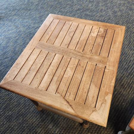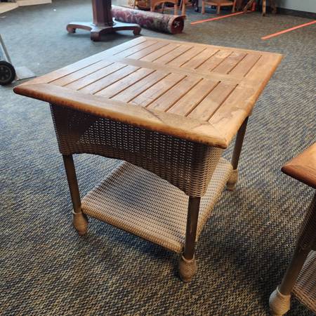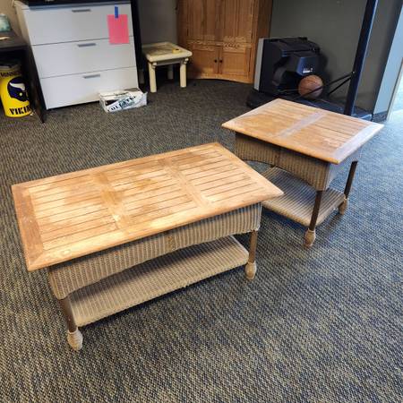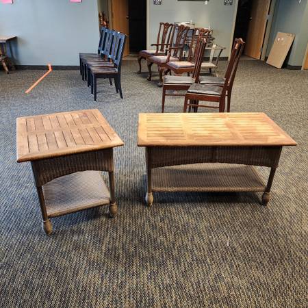 Wood topped wicker tables. One coffee table and one side table.