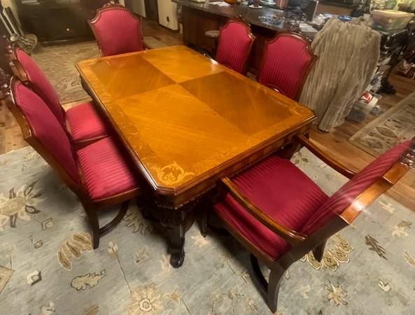 Beautiful antique carved walnut dining table with ornate inlay in good condition.