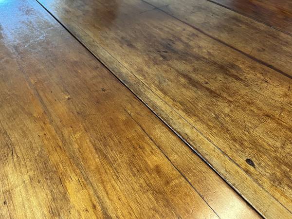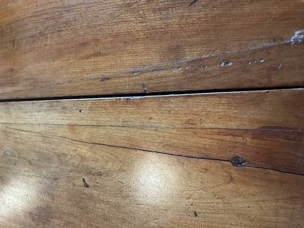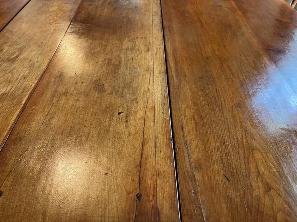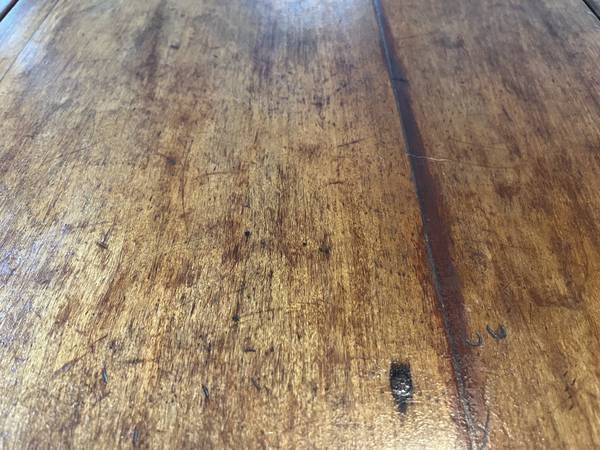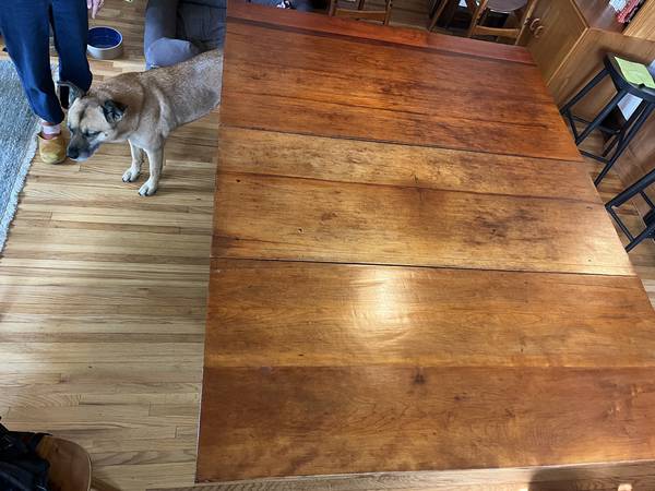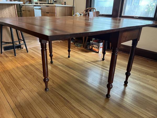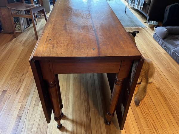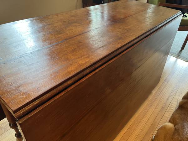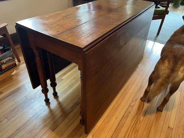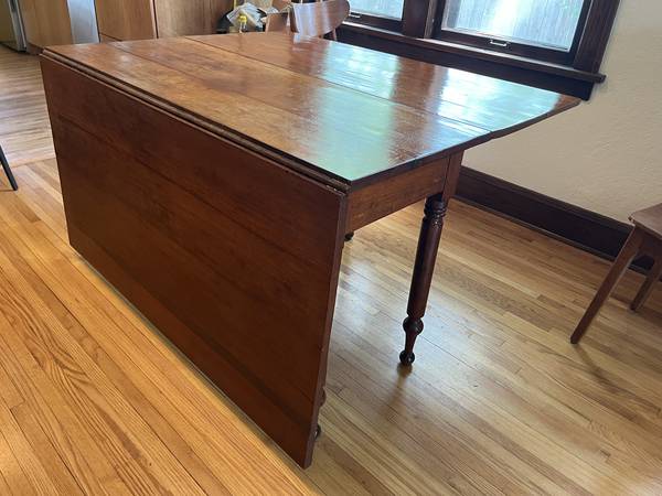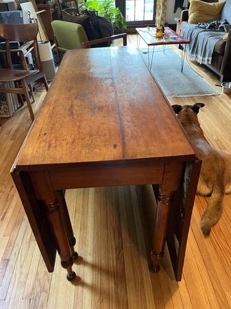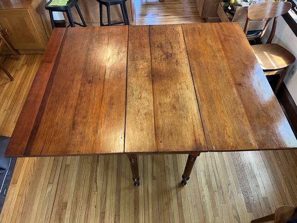 Beautiful antique handmade wooden drop leaf table for sale. It has been well-loved but looks all the more beautiful for it. Tried to show the flaws -- it's solid as can be but has lots of little dings, etc. 29" tall. With both leaves down it's 20" wide, with the shorter leaf up, it's 40", with the longer leaf it's 46", and with both sides open it's 66" long (5'6"). We love this thing to death but it's just too big for our tiny dining room