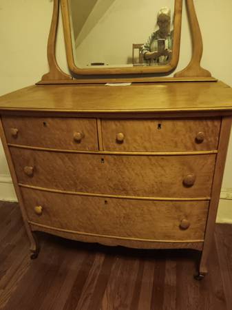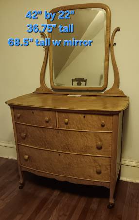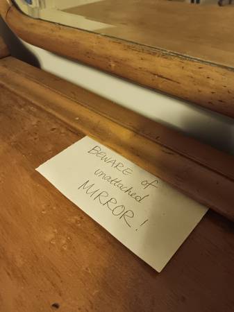 Beautifully made. Has wheels Mirror not attached. Has small issues on top w veneer. 68 1/2" wide mirror.