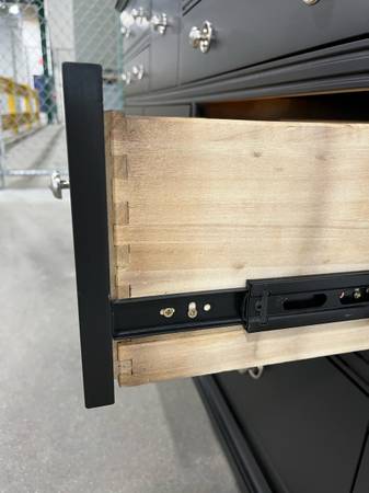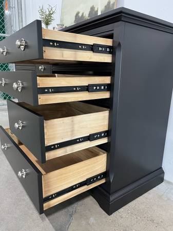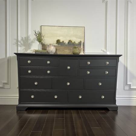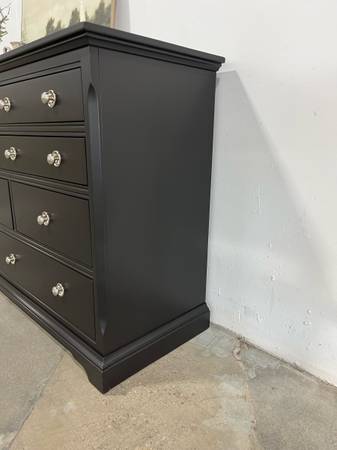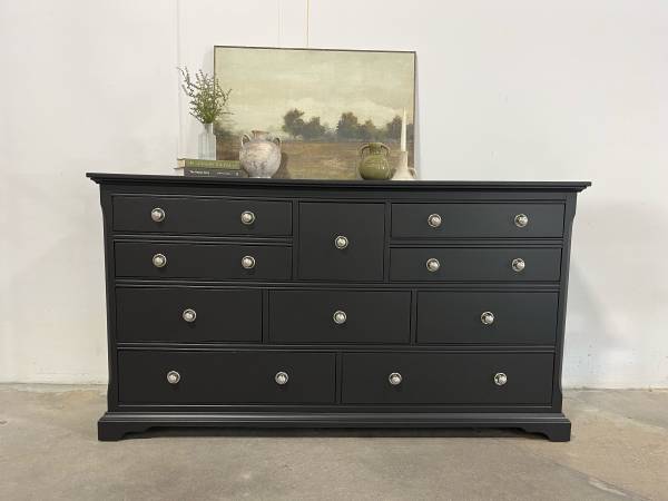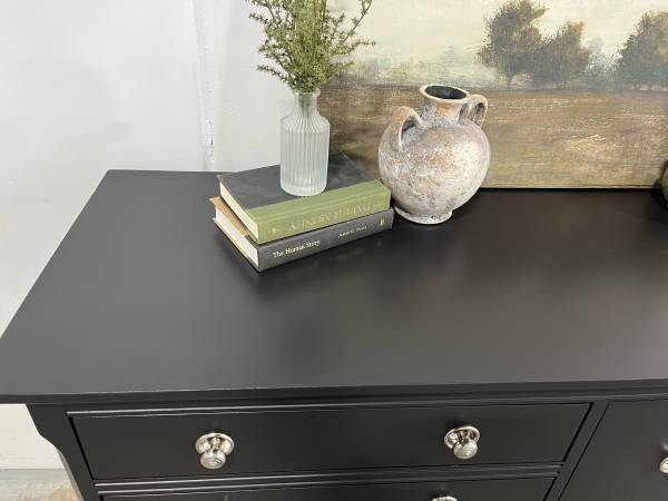 This gorgeous black dresser features smooth luxury glides, solid dovetail joints, and elegant silver hardware. Offering ample storage and timeless sophistication that would look stunning in any home.