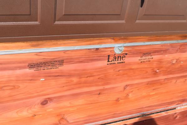 Cedar Chest by" Lane FurnitureCo." No lock. Made- 01-15-85, Serial number-2585110. Size is- 48" wide, 16" deep, and stands 17" high. Cash only.