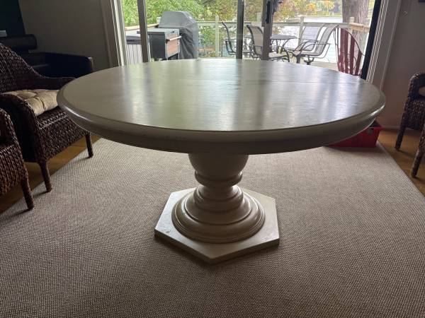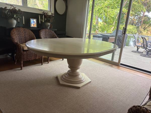Cream Pedestal dining table 54” round 18” leaf Extended 72”x54” Depending on chair sizes, this table accommodates 6-8,10 Perfect for family, food and memories Paula Dehn Furniture original $1,200