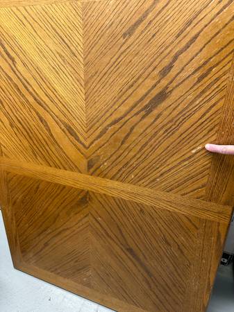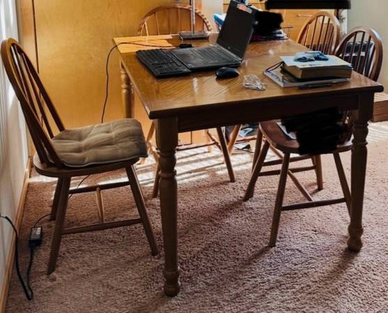 This is an all wood dining room table and chairs. It’s solid, sturdy and durable. Additionally, it has an insertable leaf to extend the length of the table for larger gatherings or for buffet style meals.