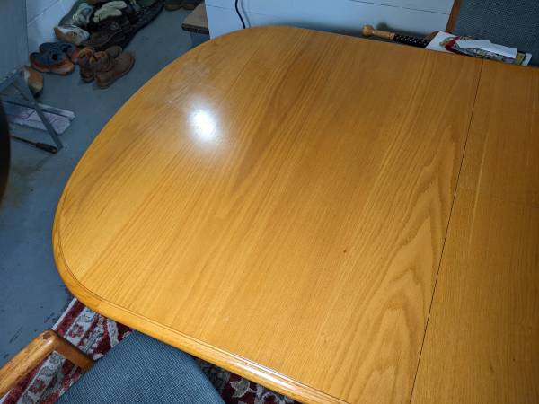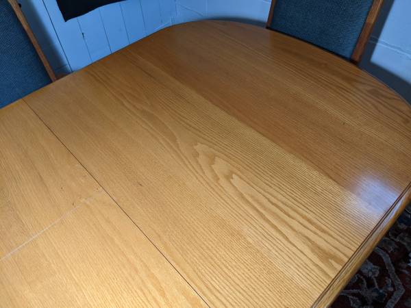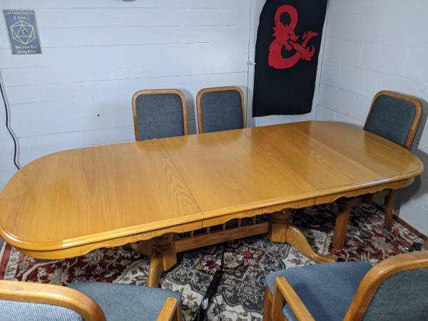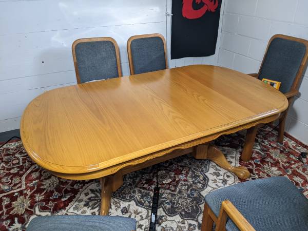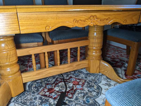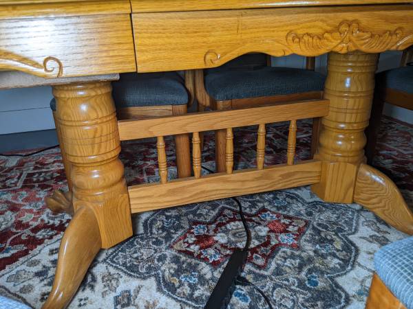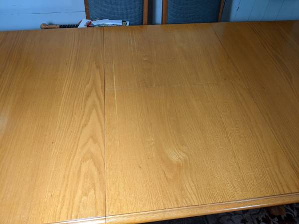 Large solid wooden dining room table with built in leaf to extend. 6 chairs to go with it. Minimal scratches/wear. Whole set fits in cargo van. Table top comes off for easy transport as well.