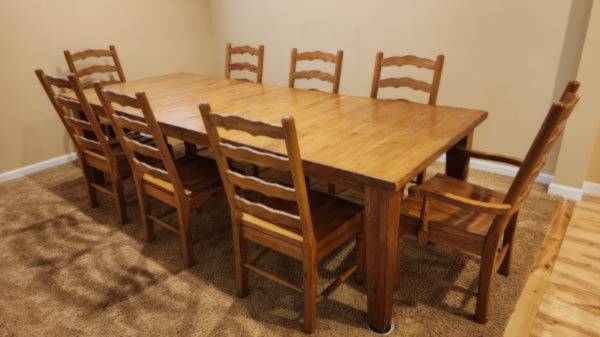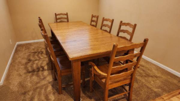 Solid, solid wood table with 2 leaves, 8 chairs in good condition.