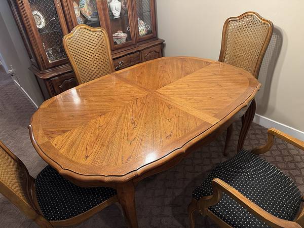 Vintage items include: • Dining table (2 extensions not pictured/in storage) with 4 chairs. • Buffet cabinet • Vintage radio • Desk • Hand knit chair Make an offer!