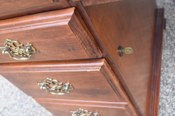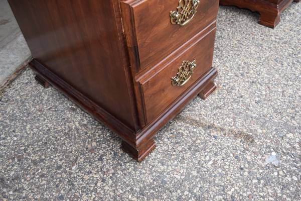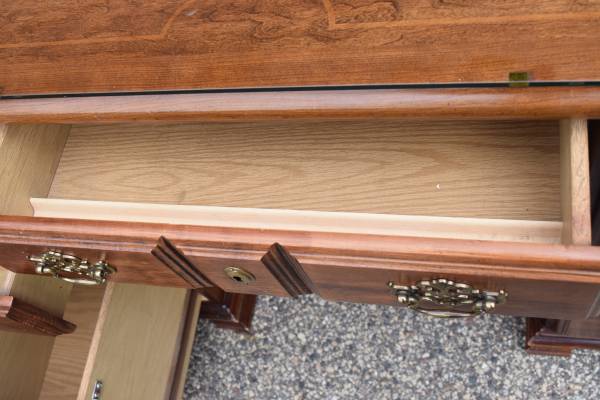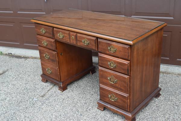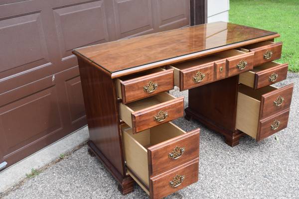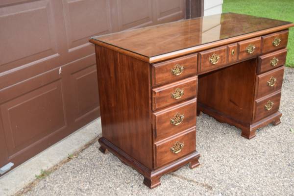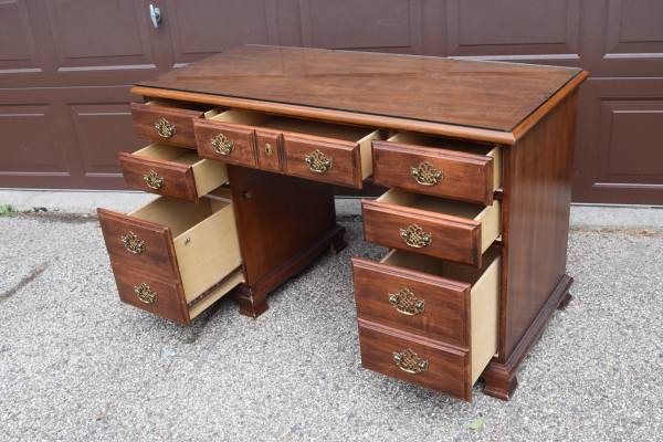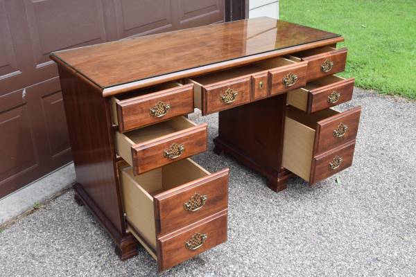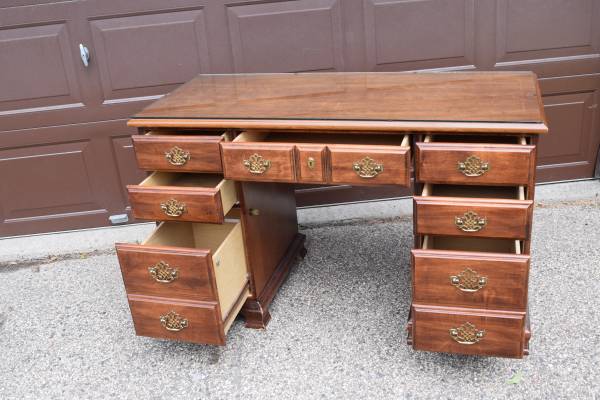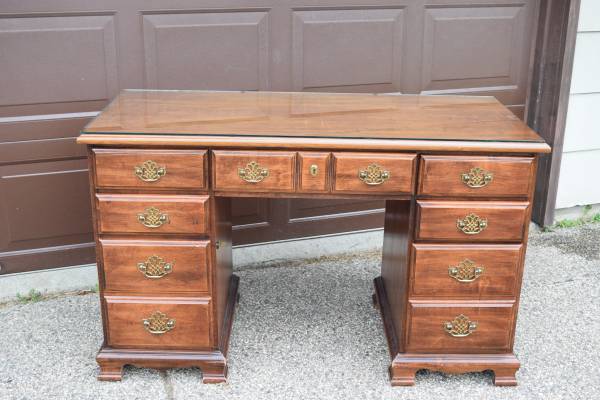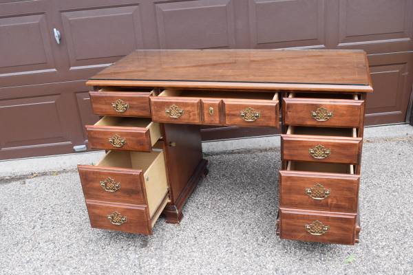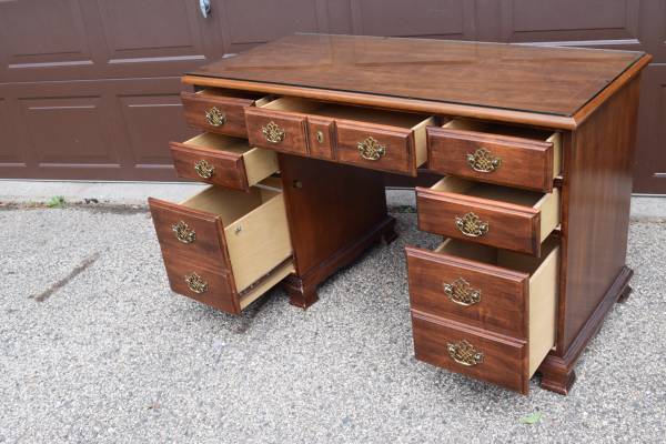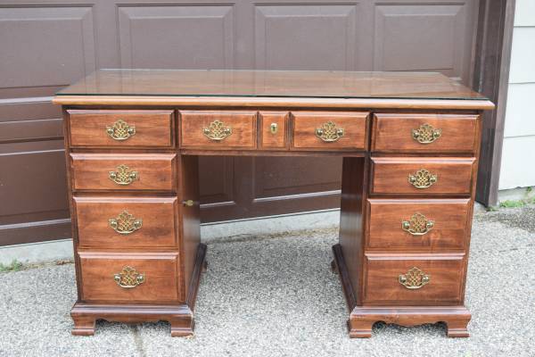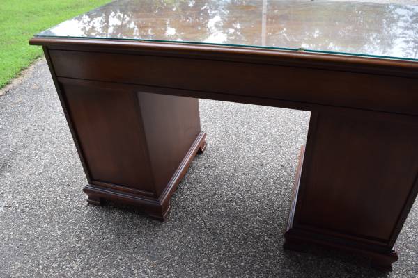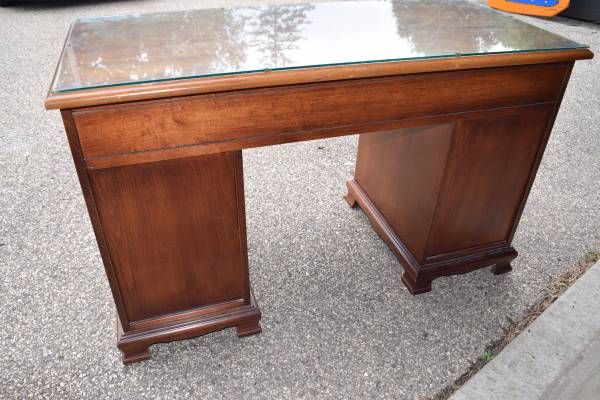 Executive Desk- has lock for file drawer. Desk has a removable glass top as shown. Desk has 7 drawers- 2 of them are file drawers- and has a lock for one file drawer. Desk is finished on the back too. Excellent condition. Size is- 50" wide, 22" deep, and stands 31" high. CASH only. If interested please message, text, or call show contact info
