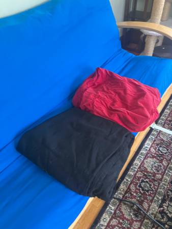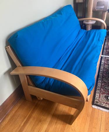 Futon Couch with full sized futon. Because of the age of the frame it makes a much better couch than a bed. Futon covers available for $20 each: black, aqua blue and red. Make an offer bundling them...