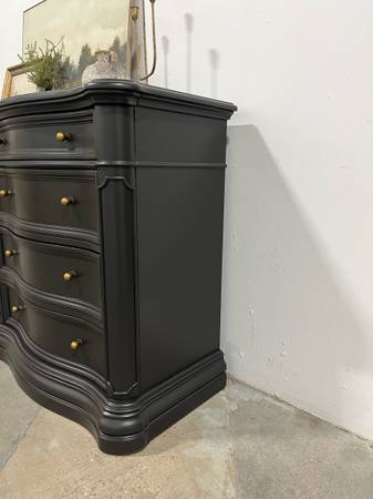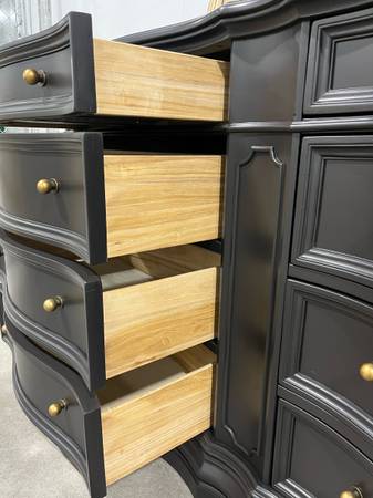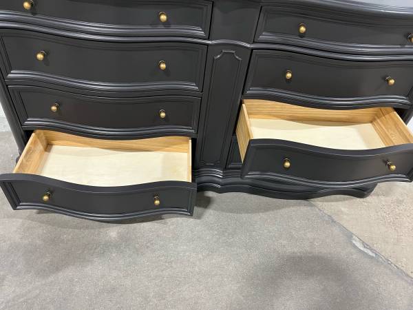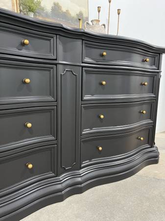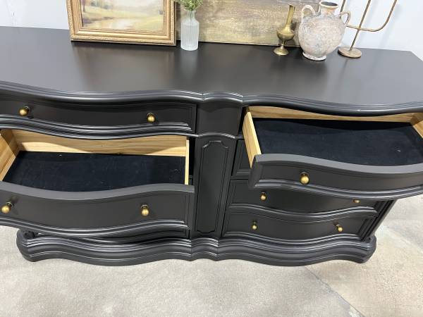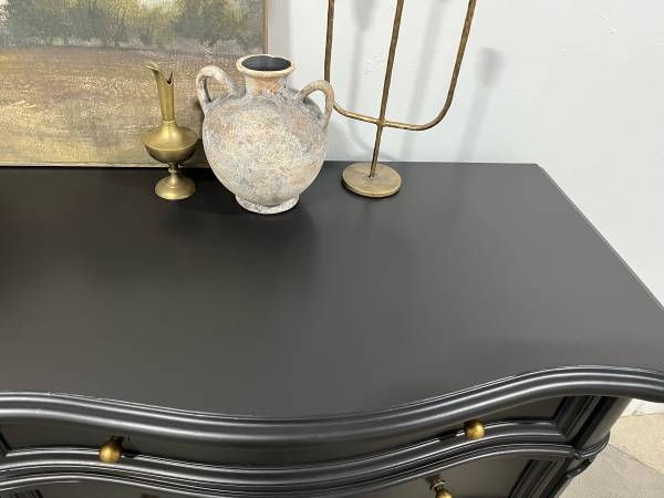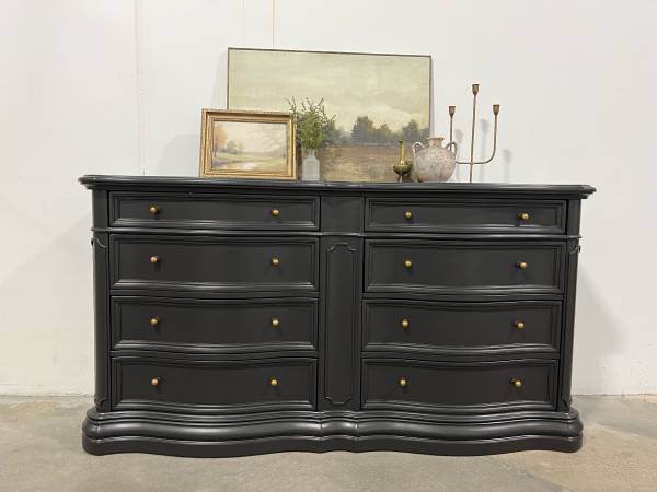 This gorgeous dresser or buffet features stunning trim detail and elegant curves, finished with modern vintage hardware that adds timeless sophistication, making it a perfect statement piece for any home.
