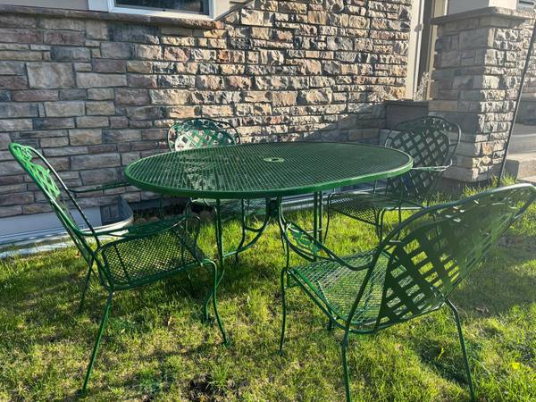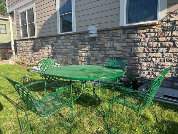 Green metal table and 4chairs . All are in great condition. 54, 38,29h.