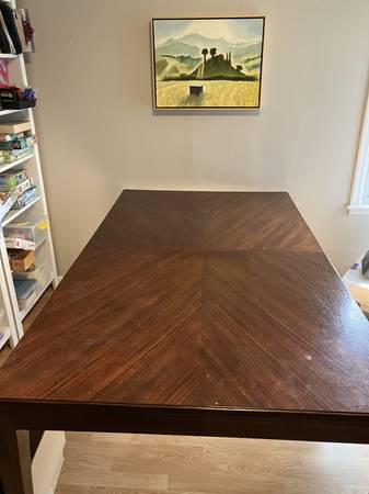 This table is too large for our space so we're letting it go. We've used it most recently as a crafting table for our young child. It is solid wood and very sturdy. Dimensions are 72" long by 42" wide, standard dining table height. There are some scuffs but it could easily be refinished.