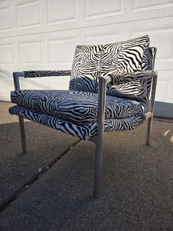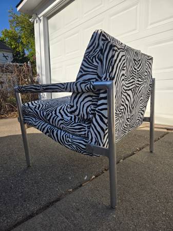 Vintage lounge chair made mid century with polished aluminum frame and zebra print upholstery. Measures 28T 27W 30D and is in good vintage condition save for maybe a light cleaning. Cash only $650...