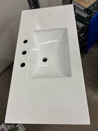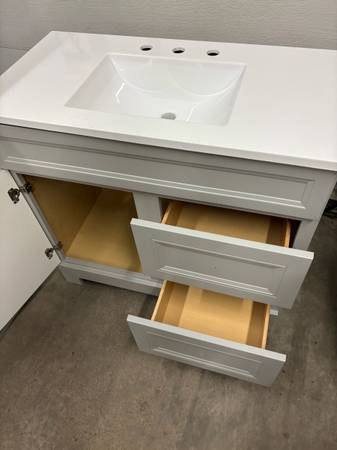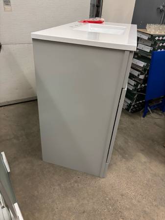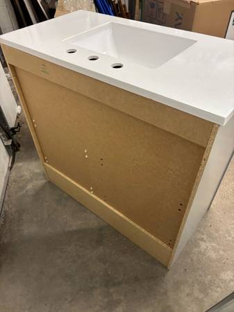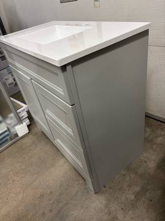 New/open box, very minor existing mark shown in pictures. Dove gray cabinet color. Features soft-close door. Pre-drilled for 8” widespread faucet (not included). Includes brushed nickel hardware....