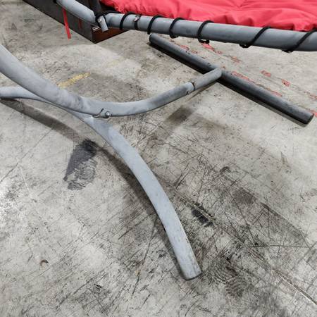 Large outdoor patio lounge swing chair with red cushion. 79" tall, 72" long, and 54" wide.