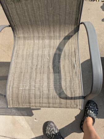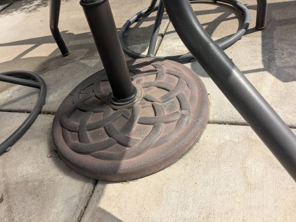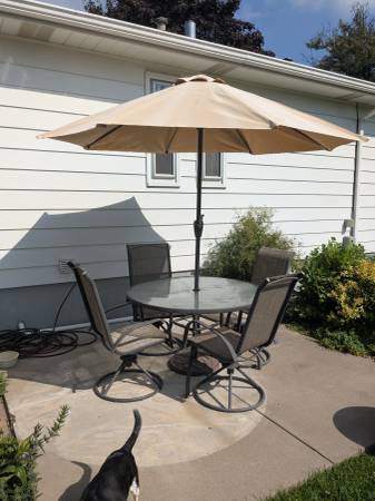 Round patio table with umbrella stand, umbrella, and four swivel chairs. Chairs show some wear (please see picture) and the base of the umbrella stand is cracked, but still works. Umbrella is on the...
