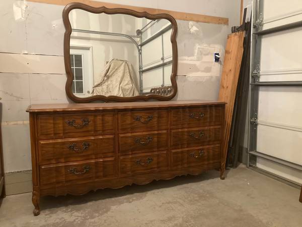 Very solid set from the 1950’s. A few cosmetic blemishes but in overall great shape. 1 - Dresser 70” Wide x 19” Deep x 50” High 1 Mirror for Dresser Above 45” Wide x 36” High (Brackets included) 1 -...
