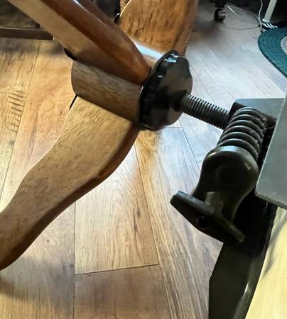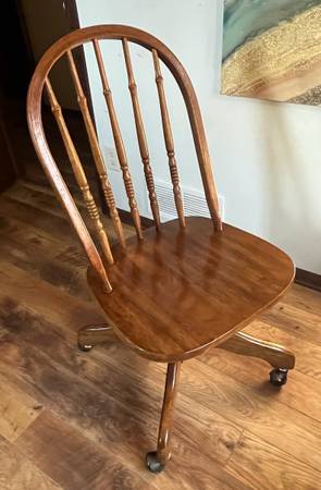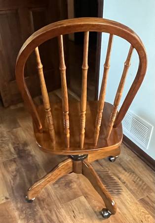 Excellent condition Oak swivel desk chair by Riverside Furniture Adjustable height Medium-tone finish with unique wood grain throughout Shapely seat on four-star base Dark metal hardware with four...