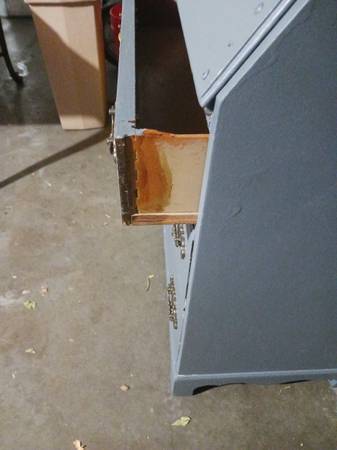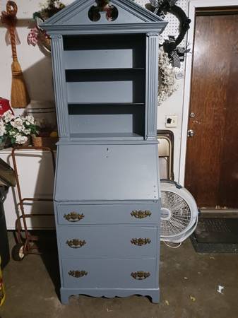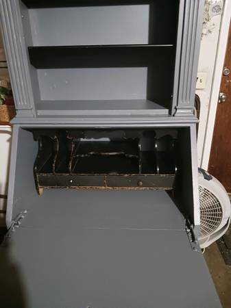 A very nice secretary/hutch. Recently painted gray with black shelves on top and a cubby in the middle. It has 3 dovetailed drawers that slide in and out easily. Sturdy and ready to use. It measures 72" x 35" x17". It can be used in kitchen, bedroom, office. Cash