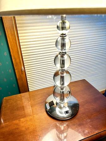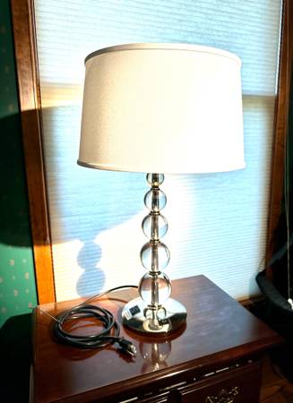 The lamp is 27.5” high, with a 8” diameter round silver finished base and a 5 glass balls decorated stylish metal stem.