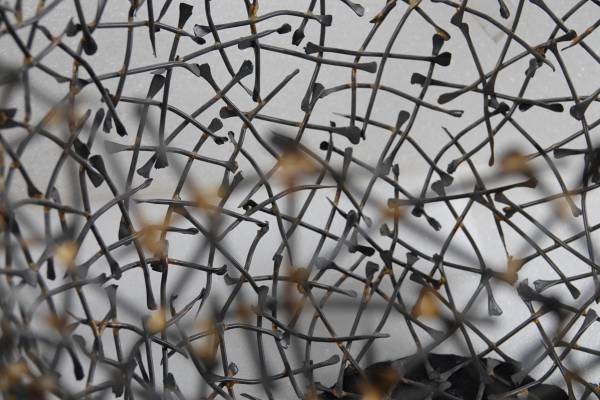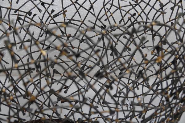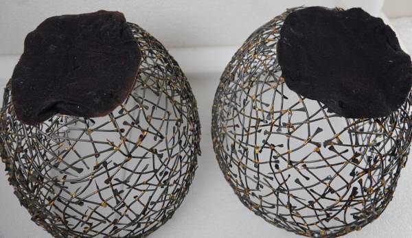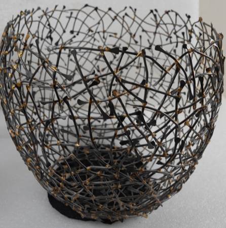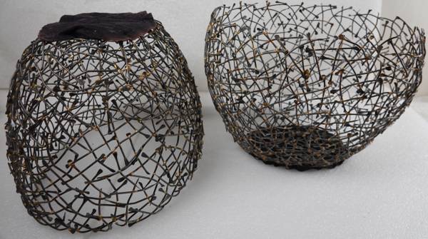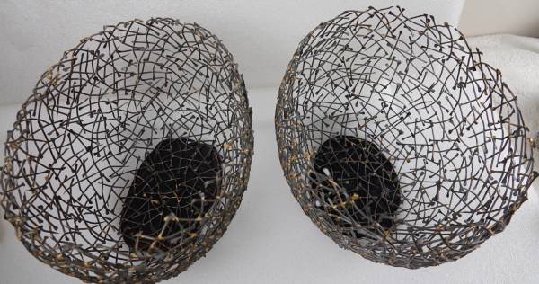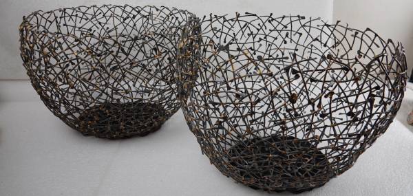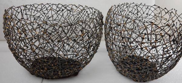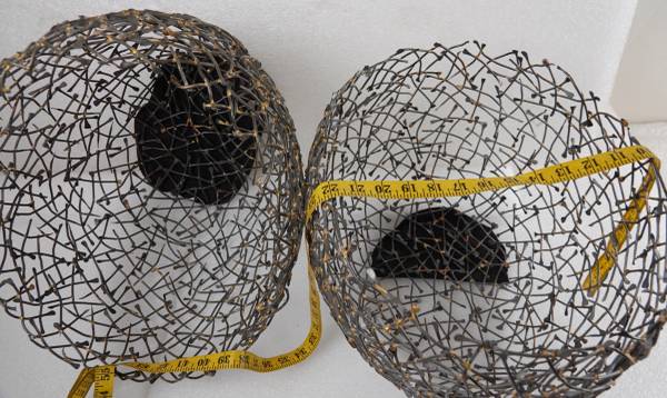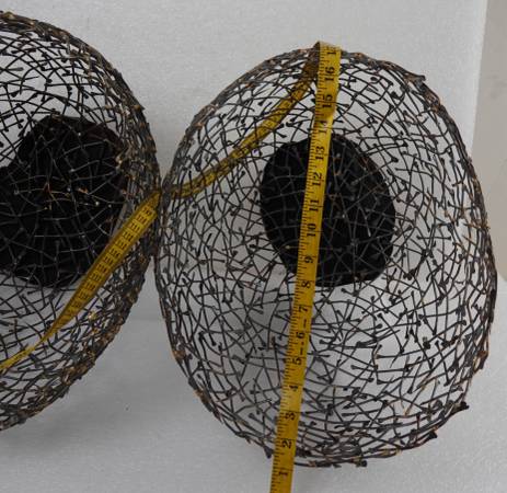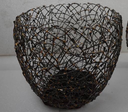 The product is a set of two unsigned welded modern nest twig planters in a Michael Aram style. The planters have a sleek design with a 17" length, 12" width, and 12" height. They are suitable for metal plants and are ideal for adding a touch of elegance to any outdoor space. Perfect for those looking to enhance their garden or patio with stylish and unique plant storage solutions.