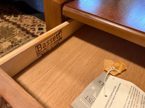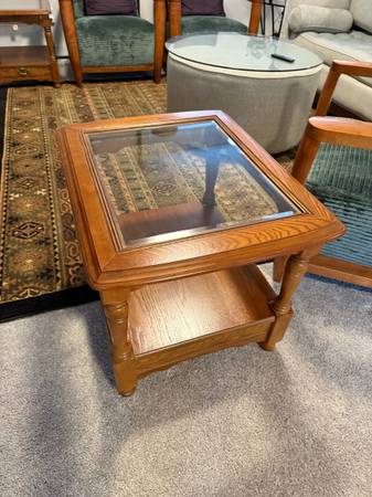 Vintage Very Good Real Wood and glass top tables. 1 coffee table with lower shelf…..$100. 2 night stand/side/end tables with drawers…..$65 each. Pretty solid and good, From no pets, no smoke home....