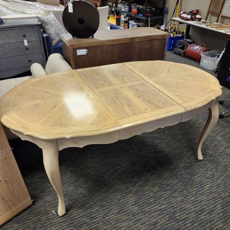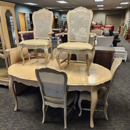 Vintage cream colored wood dining room table with two leaves and table top pads, as well as six dining chairs (2 captain and 4 side). Table is 29.75" tall, 42" wide, and 54" long with no leaves, and both leaves are 20" wide. Chairs are 41.25" tall with seats at 18".