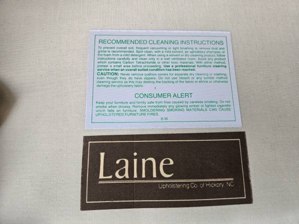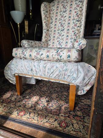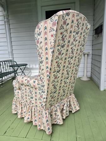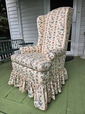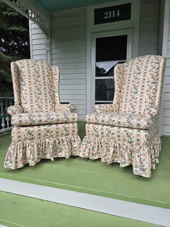 Pair of vintage tall back armchairs made late 20th century by Laine. Each measures 45T 25W 29D and are in good vintage condition. Skirting is easily removed for a more modern look. Cash only $250...