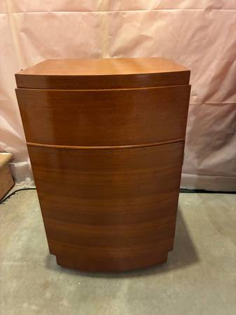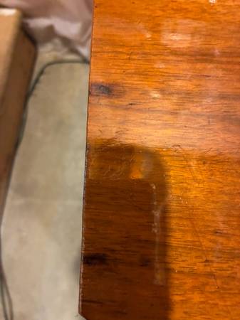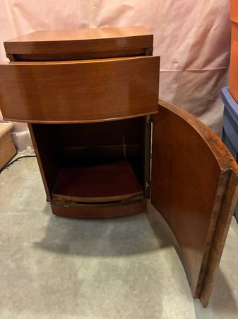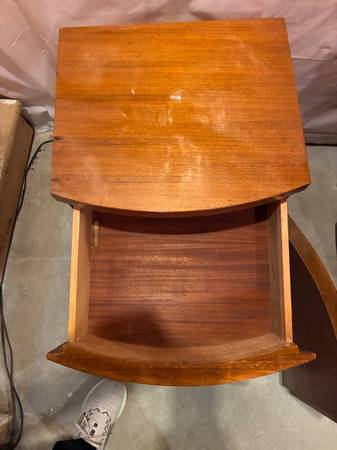 Vintage table with drawer and interesting curved enclosed lower. Small discoloration from previous owner as noted in pics.
